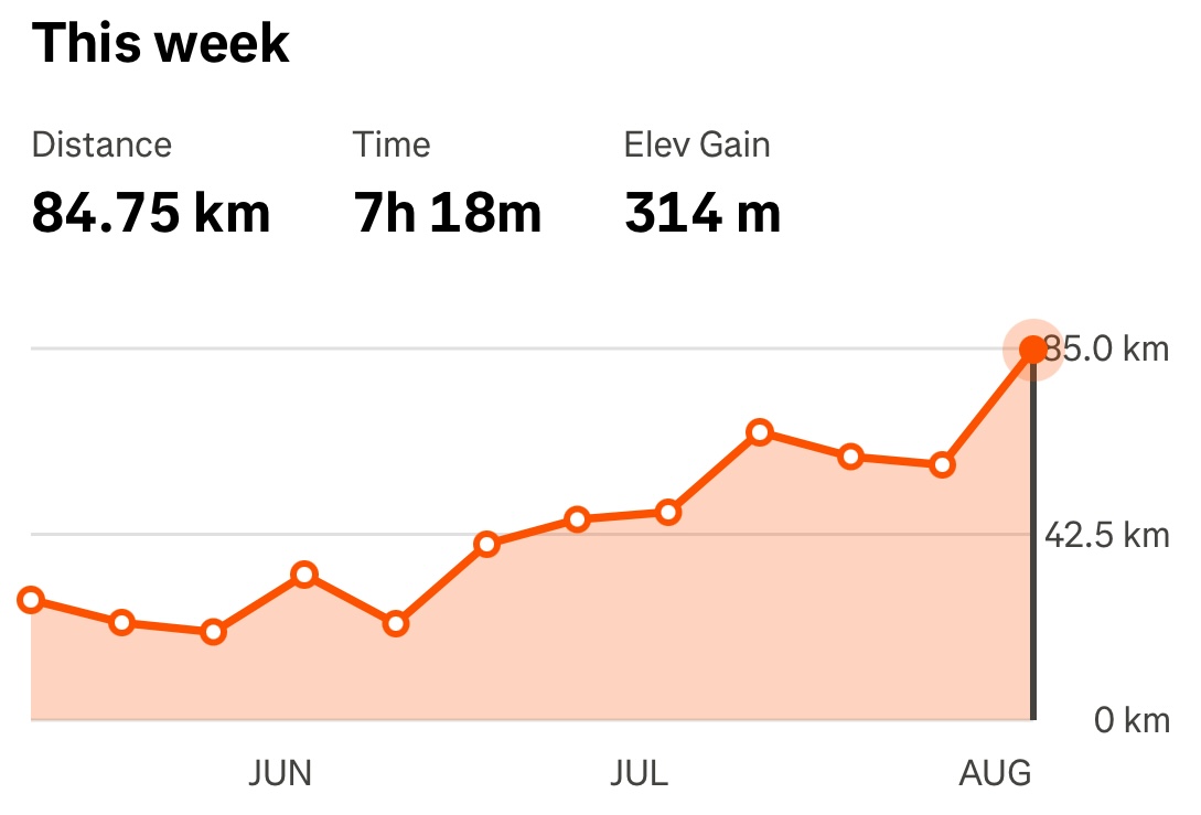 Сейчас пиковая фаза, и на этой неделе набегал непривычно много - 85 км.